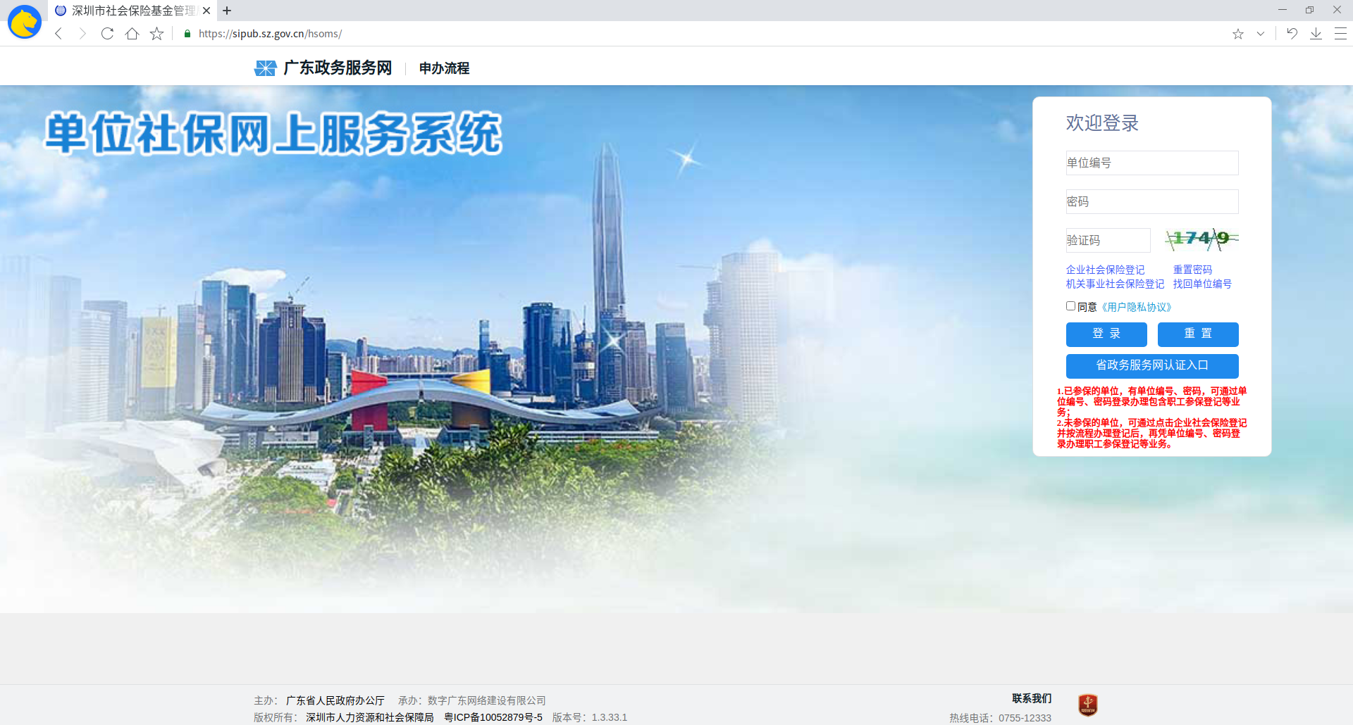 第一步:打开深圳市单位社保网上服务系统官网,输入单位编号、密码及验证码,勾选“同意《用户隐私协议》”点击“登录”。