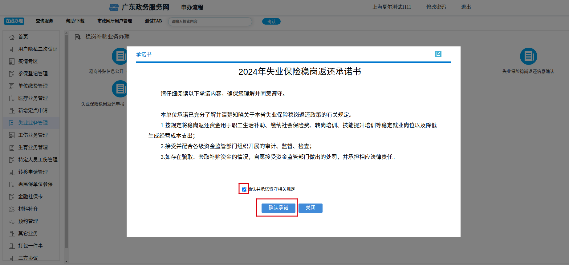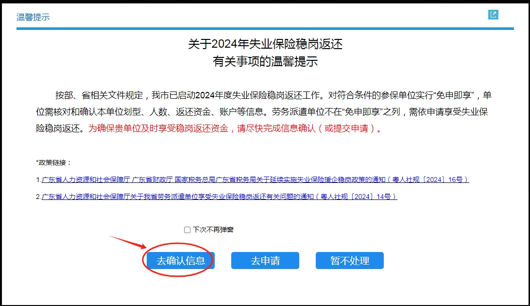 第二步:登录后,系统弹窗“关于2024年失业保险稳岗返还有关事项的温馨提示”,可以点击“去确认信息”,自动跳转办理“失业保险稳岗返还信息确认”业务。另,也可以选择按“在线办理-失业业务管理”的路径,去办理“失业保险稳岗返还信息确认”业务。