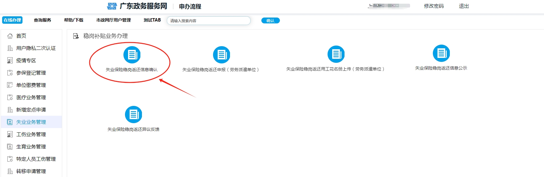 第二步:登录后,按“在线服务—社会保障—失业保险”路径,选择“失业保险稳岗返还信息确认”业务并点击“单位办理”。