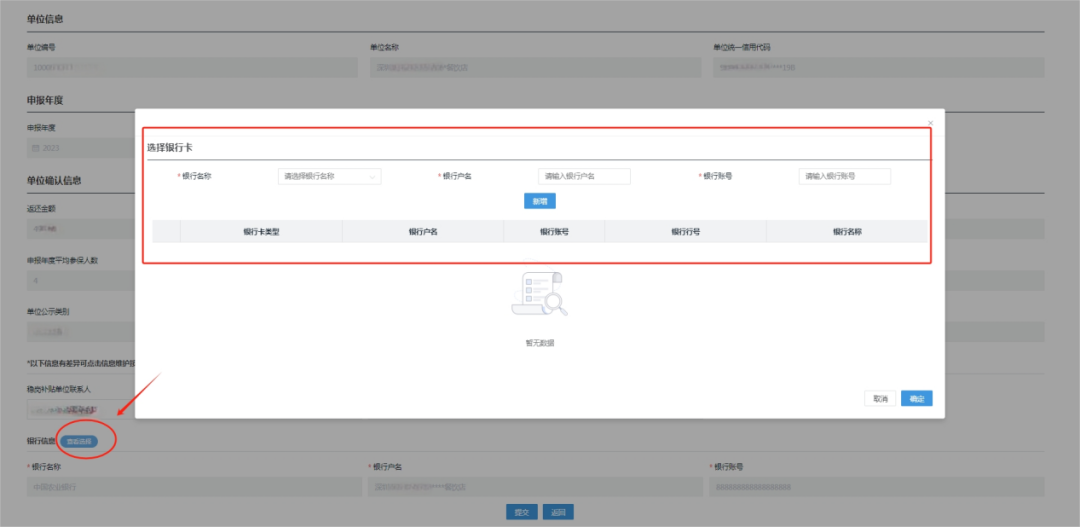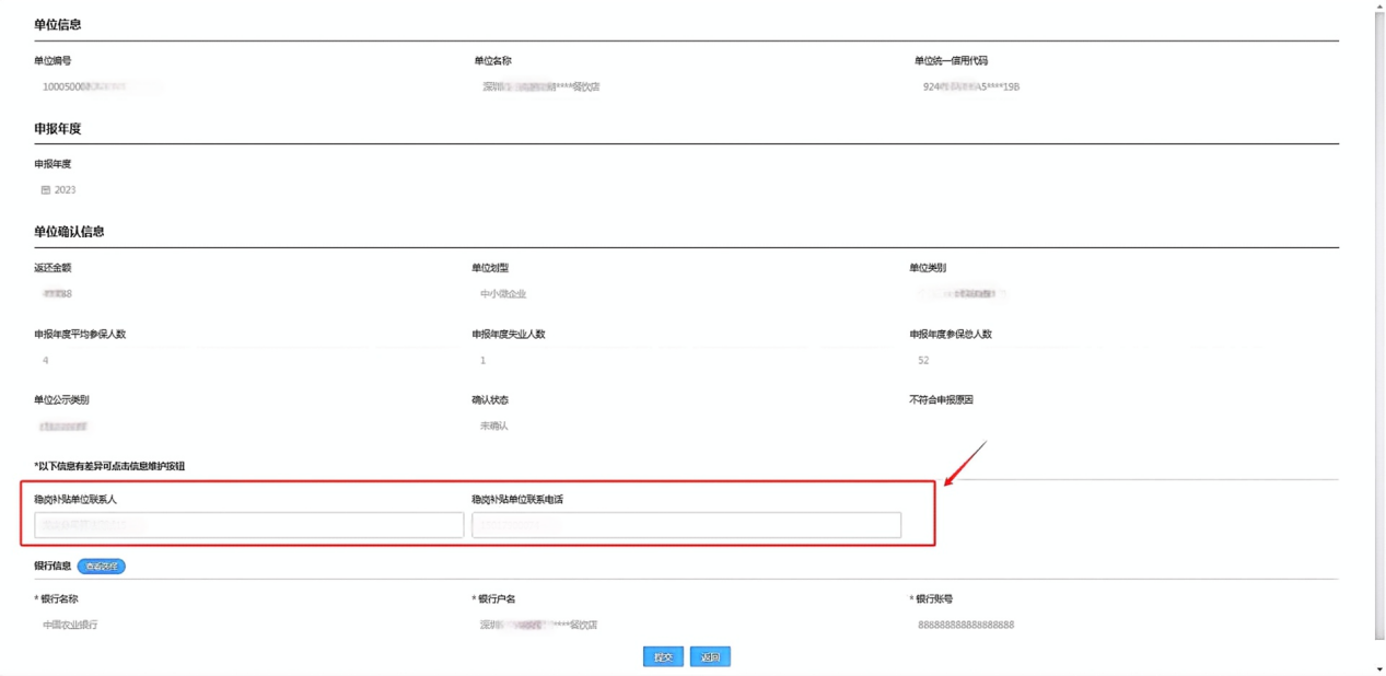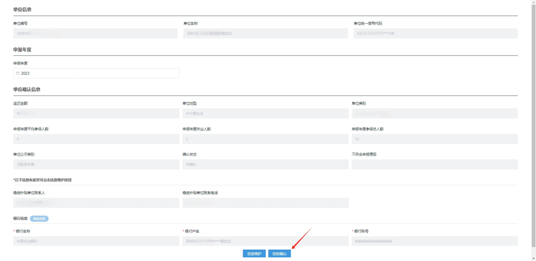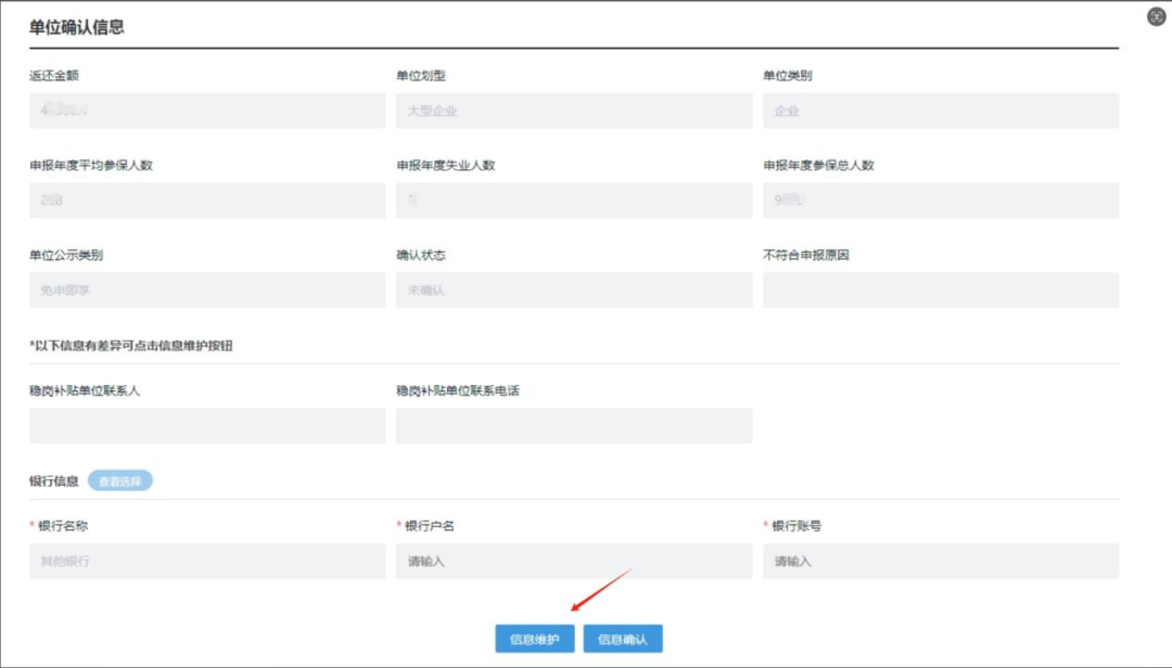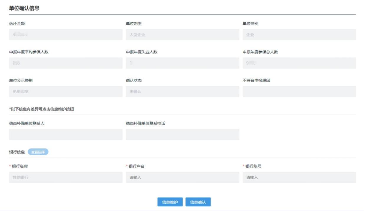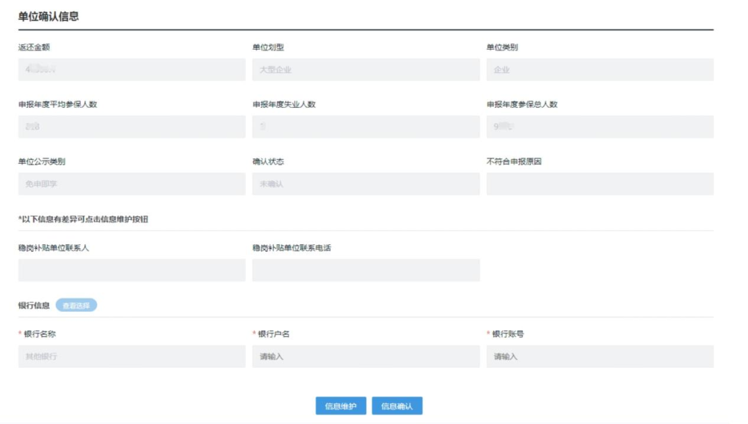 第五步:核对和确认本单位划型、人数、返还资金、账户等信息。若单位联系人、联系电话或银行信息有误,可点击“信息维护”进行修改。