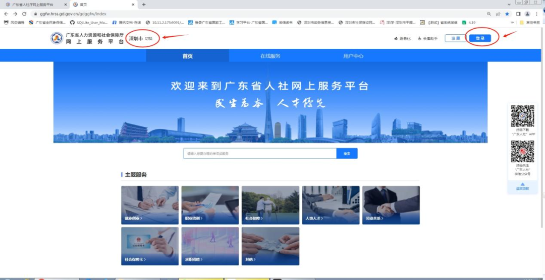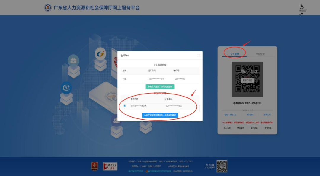 第一步:打开广东省人力资源和社会保障厅网上服务平台官网,选择切换地市为深圳,点击“个人登录”,选择已授权的单位账号(个人注册登录详见操作指引)。(超链接:https://hrss.sz.gov.cn/szsi/sbjxxgk/tzgg/simtgg/content/post_11724896.html)