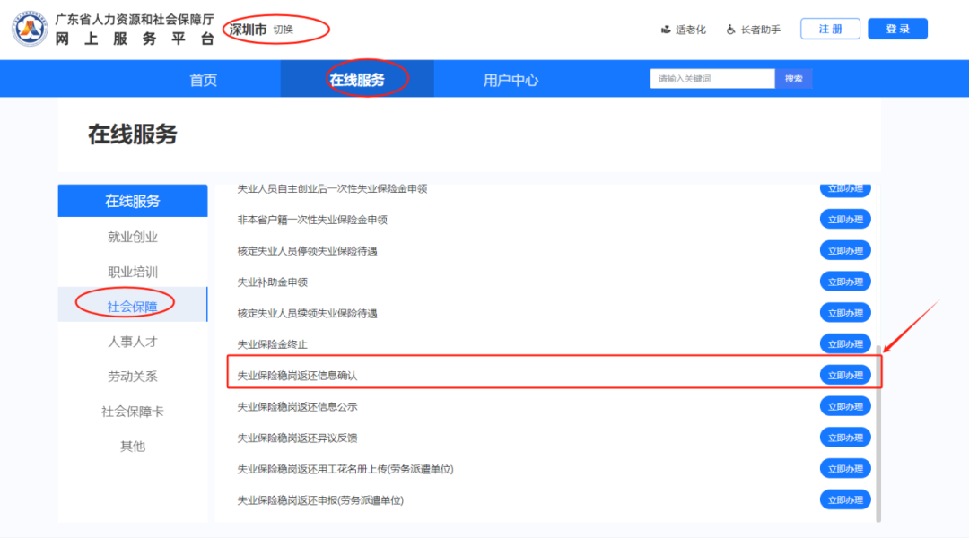 登录广东省人力资源和社会保障厅网上服务平台(https://ggfw.hrss.gd.gov.cn/),切换地区为“深圳市”,按照“在线服务-社会保障-失业保险”路径,点击“失业保险稳岗返还信息确认”查看并确认申领。详细操作流程如下: