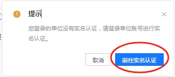 第三步:在点击“单位办理”后,若检查到单位未完成实名认证,系统会提示单位经办人员需要实名认证。单位授权的个人账号完成实名认证后可继续办理。
