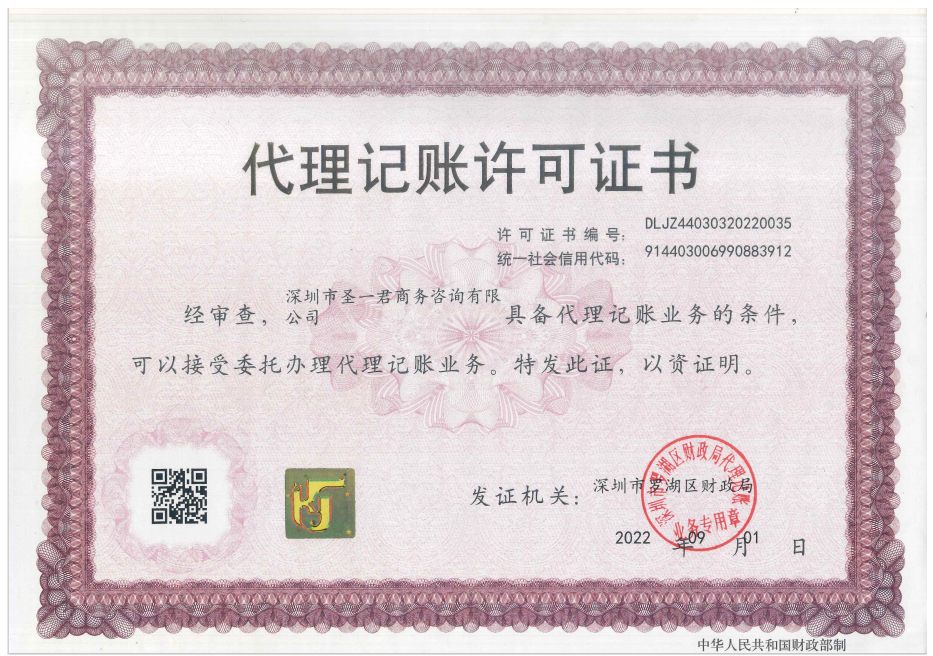 深圳市圣一君商务咨询有限公司成立于2010 年1月是严格依照国家法律、法规,由工商行政管理部门登记核准成立。并取得财政局颁发的《代理记账许可证》